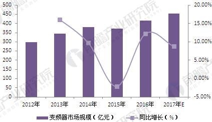 图表1:2012-2017年中国变频器行业市场规模及增长(单位:亿元,%)