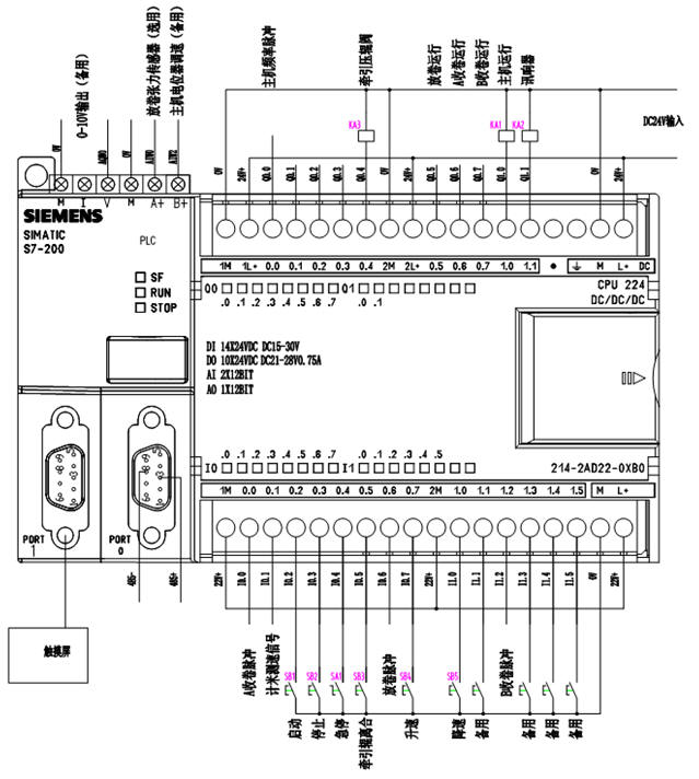 3、PLC:西门子S7-200。气滑差轴收卷时,需加配1只2路模拟量输出模块(EM232);